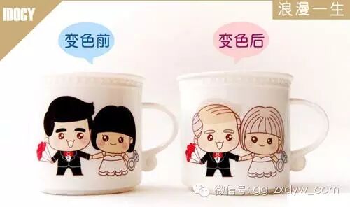 送杯子,寓意着“一辈子”。想必你们家也是有很多杯子的,但是这个很特别哦,是会遇水变色,背后有一段很浪漫的故事:向杯中缓缓加入热水,杯身上的一堆恋人,从两鬓开始,满头乌发慢慢变白。注入热水的变色过程,就仿佛随着爱的升温,我们一起慢慢变老~